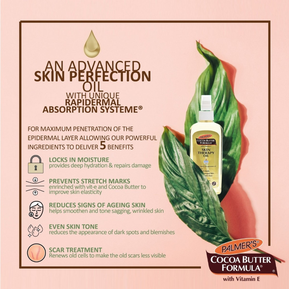 زيت علاج البشرة بتركيبة زبدة الكاكاو من بالمرز هو منتج متقدم متعدد الأغراض يعمل على تحسين البشرة ويمكن استخدامه في جميع أنحاء الجسم. تحتوي هذه التركيبة الخالية من المواد الحافظة وخفيفة الوزن على مزيج خاص من المكونات الأساسية المصممة للمساعدة في تحسين مظهر الندبات وعلامات التمدد والجلد الجاف والتالف وتفاوت لون البشرة وشيخوخة الجلد والخطوط الدقيقة والتجاعيد. تبدو البشرة وملمسها ناعمًا وسلسًا على الفور مع هذه التركيبة الفريدة الخالية من الزيوت والتي لا تسبب تلطيخًا.