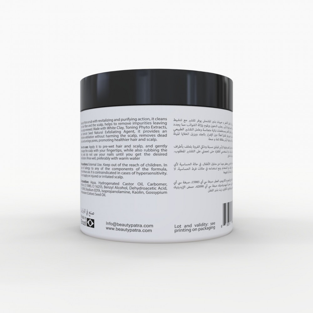 قناع التقشير بيوتي باترا بالطين الأخضر و حبيبات بذور المشمش يوفر تقشير مع تنشيط وتنقية ، ينظف ألياف الشعر وفروة الرأس، يحارب الدهون ويقوم بإزالة الشوائب مما يجدد فروة الرأس
